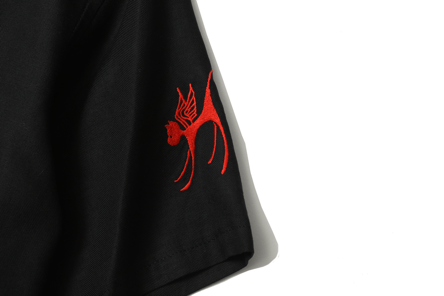 今回のコラボレーションは、RUDE GALLERYの「BOWLING SHIRT」をベースに制作。浅井によるグラフィックデザインを刺繍し、RUDE GALLERYがコラボレーションの形を具現化したワッペンを施し、「DEAD BALL BOWLING SHIRT」として完成した。