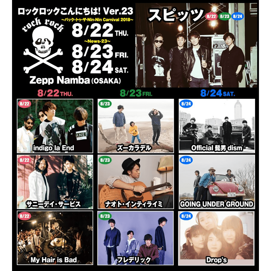 なお、8月22日(木)に開催すると先月発表された「ロックロックこんにちは!Ver.23 〜バック・トゥ・ザ・Nin-Nin Carnival 2018〜」では、昨年台風で残念ながら中止となった22回目の初日公演に出演を予定していたバンドの熱意により、約1年ぶりの再集結が実現する。